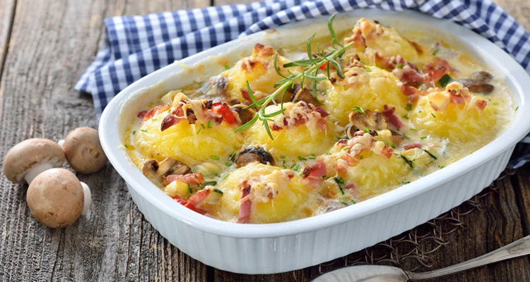 Überbackene Erdäpfelknödel mit Speck, Champignons und
