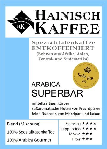 Arabica Decaf Superbar Kaffee (250g - entkoffeiniert) gemahlen für Karlsbader Kanne <p><strong style="font-family: Poppins, sans-serif; color: rgb(51, 51, 51); font-size: 14px; letter-spacing: normal;">CUPPING PROFIL</strong><span style="color: rgb(51, 51, 51); font-family: Poppins, sans-serif; font-size: 14px; letter-spacing: normal;"></span><div style="margin-left: 40px; font-family: Poppins, sans-serif; color: rgb(51, 51, 51); font-size: 14px; letter-spacing: normal;">mittelkräftiger Körper - süßaromatische Noten von Fruchtpüree - feine Nuancen von Marzipan und Kakao</div><strong style="font-family: Poppins, sans-serif; color: rgb(51, 51, 51); font-size: 14px; letter-spacing: normal;">HERKUNFT</strong><span style="color: rgb(51, 51, 51); font-family: Poppins, sans-serif; font-size: 14px; letter-spacing: normal;"></span><div style="margin-left: 40px; font-family: Poppins, sans-serif; color: rgb(51, 51, 51); font-size: 14px; letter-spacing: normal;">Blend (Afrika, Asien, Zentral- und Südamerika)</div><strong style="font-family: Poppins, sans-serif; color: rgb(51, 51, 51); font-size: 14px; letter-spacing: normal;">SORTE</strong><span style="color: rgb(51, 51, 51); font-family: Poppins, sans-serif; font-size: 14px; letter-spacing: normal;"></span><div style="margin-left: 40px; font-family: Poppins, sans-serif; color: rgb(51, 51, 51); font-size: 14px; letter-spacing: normal;">100% Arabica</div><strong style="font-family: Poppins, sans-serif; color: rgb(51, 51, 51); font-size: 14px; letter-spacing: normal;">AUFBEREITUNG</strong><span style="color: rgb(51, 51, 51); font-family: Poppins, sans-serif; font-size: 14px; letter-spacing: normal;"></span><div style="margin-left: 40px; font-family: Poppins, sans-serif; color: rgb(51, 51, 51); font-size: 14px; letter-spacing: normal;">handverlesen - natural (trocken) & washed (gewaschen - nass) - sonnengetrocknet - ungespritzt - frisch geröstet - <strong>entkoffeiniert</strong></div><strong style="font-family: Poppins, sans-serif; color: rgb(51, 51, 51); font-size: 14px; letter-spacing: normal;">RÖSTGRAD</strong><span style="color: rgb(51, 51, 51); font-family: Poppins, sans-serif; font-size: 14px; letter-spacing: normal;"></span><div style="margin-left: 40px; font-family: Poppins, sans-serif; color: rgb(51, 51, 51); font-size: 14px; letter-spacing: normal;">Triestiner Röstung (Full City Roast)</div><hr style="margin-top: 18px; margin-bottom: 18px; font-family: Poppins, sans-serif; border-top-color: rgb(238, 238, 238); font-size: 14px; letter-spacing: normal;"><span style="color: rgb(51, 51, 51); font-family: Poppins, sans-serif; font-size: 14px; letter-spacing: normal;">Dieser entkoffeinierte Kaffee hat alles, was ein intensiver Espresso italienischer Art hat: einen kräftigen Kaffeegeschmack mit einer fein ausgeprägten Crema, allerdings ausgenommen das Koffein. Er ist ein Kaffee mit einem mittelkräftigen Körper und einem feinen Mokka-Aroma mit süßaromatischen Noten von Fruchtpüree, welches von feinen Nuancen von Marzipan und Kakao umspielt wird.</span><br style="font-family: Poppins, sans-serif; color: rgb(51, 51, 51); font-size: 14px; letter-spacing: normal;"><br style="font-family: Poppins, sans-serif; color: rgb(51, 51, 51); font-size: 14px; letter-spacing: normal;"><span style="color: rgb(51, 51, 51); font-family: Poppins, sans-serif; font-size: 14px; letter-spacing: normal;">Diesen Kaffee haben wir erstmals geröstet als Günter´s Mutter einen koffeinfreien Kaffee wollte, der trotzdem nach "echtem" Kaffee schmecken sollte. Mit diesem Arabica-Blend (Mischung) und einer norditalienischen Espressoröstung ist uns das äußerst gut gelungen. Geschmacklich wird es Ihnen schwerfallen, ihn von einem traditionellen Arabica-Blend zu unterscheiden.</span><br style="font-family: Poppins, sans-serif; color: rgb(51, 51, 51); font-size: 14px; letter-spacing: normal;"><br style="font-family: Poppins, sans-serif; color: rgb(51, 51, 51); font-size: 14px; letter-spacing: normal;"><span style="color: rgb(51, 51, 51); font-family: Poppins, sans-serif; font-size: 14px; letter-spacing: normal;">Mit diesem feinen Kaffee wird ihre Suche nach einem "echten Kaffee ohne Koffein" belohnt. Sie werden diesen erlesenen "koffeinfreien" Kaffeegenuss von der ersten Tasse weg nie mehr missen wollen. </span></p><p><strong style="font-family: Poppins, sans-serif; font-size: 14px; letter-spacing: normal;">Angaben gemäß den Vorschriften der EU-Lebensmittelinformations-Verordnung Nr. 1169/2011 und gemäß den Vorschriften der EU-Produktsicherheits-Verordnung (GPSR)</strong><br style="font-family: Poppins, sans-serif; font-size: 14px; letter-spacing: normal;"><em style="font-family: Poppins, sans-serif; font-size: 14px; letter-spacing: normal;">Verkehrsbezeichnung:</em><span style="font-family: Poppins, sans-serif; font-size: 14px; letter-spacing: normal;"> Kaffee - entkoffeiniert (Röstkaffee)</span><br style="font-family: Poppins, sans-serif; font-size: 14px; letter-spacing: normal;"><em style="font-family: Poppins, sans-serif; font-size: 14px; letter-spacing: normal;">Zutaten:</em><span style="font-family: Poppins, sans-serif; font-size: 14px; letter-spacing: normal;"> 100% Kaffee (Bohnen aus Afrika, Asien, Zentral- und Südamerika)</span><br style="font-family: Poppins, sans-serif; font-size: 14px; letter-spacing: normal;"><em style="font-family: Poppins, sans-serif; font-size: 14px; letter-spacing: normal;">Nettofüllmenge:</em><span style="font-family: Poppins, sans-serif; font-size: 14px; letter-spacing: normal;"> 250g</span><br style="font-family: Poppins, sans-serif; font-size: 14px; letter-spacing: normal;"><em style="font-family: Poppins, sans-serif; font-size: 14px; letter-spacing: normal;">Mindesthaltbarkeitsdatum:</em><span style="font-family: Poppins, sans-serif; font-size: 14px; letter-spacing: normal;"> siehe Etikett auf der Packung, Restlaufzeit bei Auslieferung jedoch mindestens 6 Monate</span><br style="font-family: Poppins, sans-serif; font-size