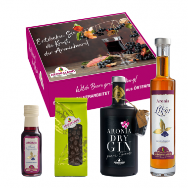 Aronia Geschenkset Genuss <ul style="color: rgb(0, 0, 0); font-family: Poppins, "Helvetica Neue", Helvetica, Arial, sans-serif; font-size: 16px;"><li>1x <a href="https://gustoreich.at/produkt/aronia-likoer_aronialand" target="_blank">Aronia Likör 0,2l</a> (€ 12,99)</li><li>1x <a href="https://gustoreich.at/produkt/aronia-dry-gin-gold-pramiert_aronialand" target="_blank">Aronia Dry Gin 350ml</a> ( € 24,99 )</li><li>1x <a href="https://gustoreich.at/produkt/aronia-schokobeeren-190-gramm_aronialand" target="_blank">Aronia Schokobeeren 190g</a> ( € 4,99)</li><li>1x <a href="https://gustoreich.at/produkt/aronia-feinste-essigvariation_aronialand" target="_blank">Aronia die feinste Essig Variation 100 ml</a> ( € 5,99)</li><li>Edler Geschenks Karton ( € 5.-)</li></ul><p><span class="status status-2" style="color: rgb(0, 0, 0); font-family: Poppins, "Helvetica Neue", Helvetica, Arial, sans-serif;"><span class="icon-text--center" style="vertical-align: middle; display: inline-block;">Sofort verfügbar</span></span><span style="color: rgb(0, 0, 0); font-family: Poppins, "Helvetica Neue", Helvetica, Arial, sans-serif;"></span></p><div class="estimated-delivery" style="color: rgb(0, 0, 0); font-family: Poppins, "Helvetica Neue", Helvetica, Arial, sans-serif; font-size: 16px;"><span class="icon-text--center" style="font-weight: bolder; vertical-align: middle; display: inline-block;">Lieferzeit:</span> <span class="a2">2 - 3 Werktage (Ausland abweichend)</span></div>