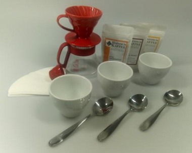 - 3 x gemahlener Kaffee (Hauskaffee, Italian Roast, LIMAJA) zum Verkosten in Portionssäckchen (jeweils für die Zubereitung einer Cupping Bowl mit dem HARIO V60 Filter)