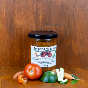 Gemüse-Kräuter Sugo<div>Aus unseren selbst angebauten Bio-Paradeisern, Zucchini und Karotten kochen wir dieses köstliche Sugo, das etwas stückiger und nicht so säurehaltig wie normales Sugo ist. Wir wollen Ihnen den ganzen Winter über den großartigen Geschmack der sonnengereiften Zutaten auf Pasta, in einer Suppe oder in Ihrem Lieblingsgericht geben.</div><div><br></div><div>Uns kommt Nichts ins Glas außer Gemüse, Salz, Pfeffer, Öl und Gewürze: Zero Zusätze wie E-Stoffe, Geschmachsverstärker, Farbstoffe oder Hefe! Weil wir dieses Sugo mit einem guten lokalen Weißwein verfeinern, kommen sehr kleine Mengen von Schwefeloxid und Sulphite mit dem Wein mit. Obwohl unser Sugo (noch) nicht bio-zertifiziert ist, verwenden wir bei der schonenden Zubereitung nur bio-zertifizierte Zutaten.</div><div><br></div><div>Zutaten: 53% Paradeiser, 18% Zucchini, 13% Karotten, 6% Zwiebeln, Grüner Veltliner (<b>Schwefeldioxid & Sulphite</b>), Olivenöl, Oregano, Zucker, Speisesalz, Petersilie, Knoblauch, Rosmarin, Schwarzer Pfeffer. </div>