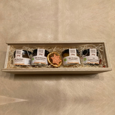Holz Kistl mit 4 Fruchtaufstrichen und Deko
