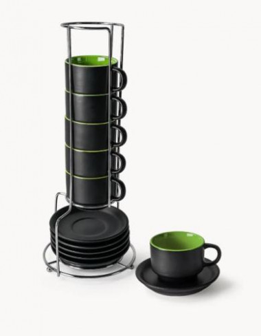 - 6er Set stapelbare Espressotassen mit Untertassen, Steingut (je 75 ml)