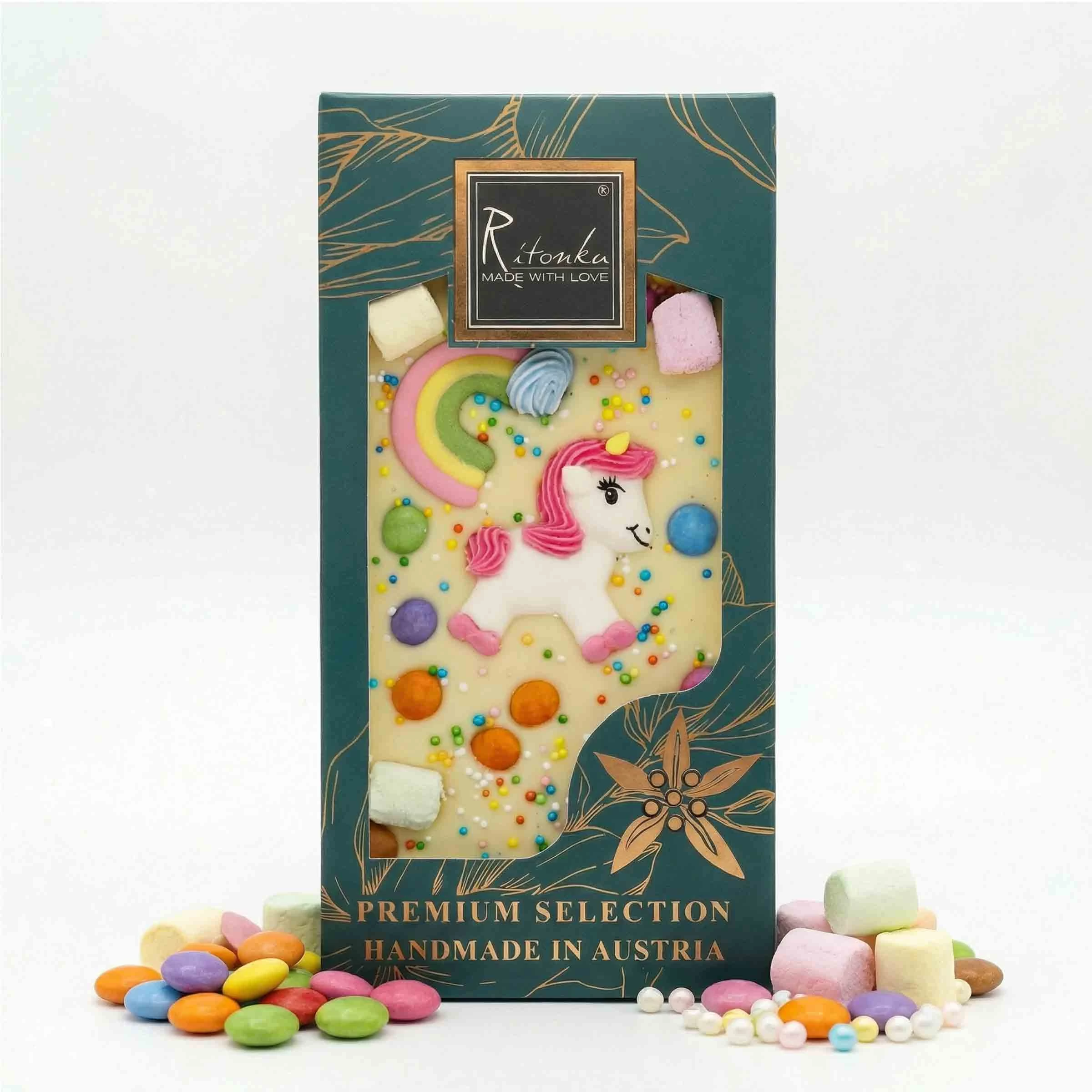 Unsere Einhorn-Schokolade begeistert kleine Genießer:innen mit süßer weißer Schokolade, flauschigen Mini-Marshmallows, fröhlich-bunten Knusperperlen und einer bezaubernden Einhorn-Dekoration. Ob als Geschenk zum Geburtstag, für die Schultüte oder einfach für ein Lächeln zwischendurch – dieses süße Kunstwerk bringt Kinderaugen zum Strahlen.
