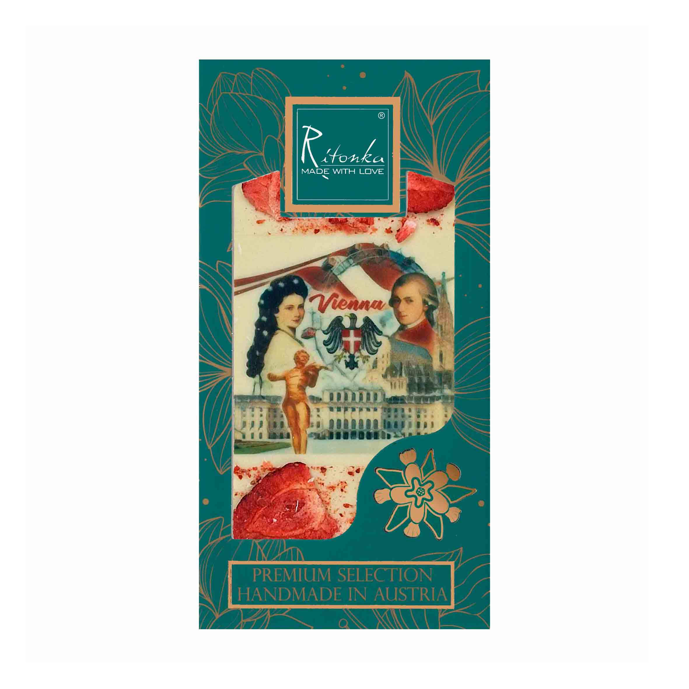 Genießen Sie königlichen Genuss mit unserer Premium Weißen Schokolade „Erdbeere Sisi“. Cremige, zartschmelzende weiße Schokolade verbindet sich meisterhaft mit dem fruchtigen Aroma gefriergetrockneter Erdbeeren. Inspiriert von der legendären Kaiserin Sisi, vereint diese verführerische Kreation feinste Zutaten mit einem Hauch Wiener Noblesse. Ein wahrhaft königlicher Genuss für alle Sinne!