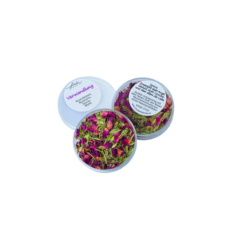 Im Duft entfaltet sich die Räuchermischung als dunkel-kräuterartig, begleitet von einem feinen, eleganten Rosenduft. Der Rauch wirkt beruhigend und zugleich stärkend und schafft eine Atmosphäre von Geborgenheit, Zuversicht und innerer Ruhe. Dadurch eignet sich „Verwandlung“ besonders gut für Meditation, Rituale zur Transformation oder stille Momente der Selbstreflexion.