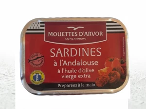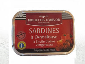 Sardine nach andalusischer Art mit Chorizo und Tomaten 115 g<ul><li _msttexthash="15198651" _msthash="519">Eine schön würzige, deftige, rustikale Rezeptur mit Rauchnoten und kleinen Chorizostückchen, die die leicht pikante, schön fruchtige Tomatensauce aromatisieren</li><li _msttexthash="2581956" _msthash="520">Darin liegt die zarte Sardine mit schön festem, saftigen Fleisch</li><li _msttexthash="6579248" _msthash="521">Eine schöne gehaltvolle Vorspeise, die sich nach richtiger Mahlzeit anfühlt und auch optisch überzeugt</li><li _msttexthash="44240612" _msthash="522">Des Genusses wegen sollten sie aber dennoch auf keinen Fall auf die vielen anderen tollen Kreationen der unvergleichlich reichen geschmacklichen Bandbreite der Sardinenkonserve verzichten: Sardinen in fruchtiger Sauce, in Weißwein, in Butter, mit Wasser und Zitrone ... Probieren Sie es aus!</li><li _msttexthash="24816181" _msthash="523">Die Sardine ist noch heute Dreh- und Angelpunkt vieler Hafenstädte in der Bretagne, aber auch in Spanien und Portugal. Dennoch ist sie glücklicherweise nicht vom Aussterben bedroht und kann ohne Reue genossen werden</li><li _msttexthash="11434709" _msthash="524">sie zergehen förmlich im Mund und zeigen ein wunderbar fruchtigen Fondant €85,21/kg</li></ul><p><span style="font-size: 8pt;" _msttexthash="68709784" _msthash="518">Zutaten:<strong _istranslated="1"> Sardinen</strong> (65%), kalt gepresstes Olivenöl vierge extra, Tomatenkonzentrat, rote Paprika, Chorizo (2,8%) (Schweinefleisch Gewürze und Aromen. Glukosesirup, Salz, Antioxidationsmittel: E 301, Konservierungsstoff: E250), Knoblauch, Zwiebeln, Oregano, Salz, Rote Chili, Verdickungsmittel: E412 und E410, Säurungsmittel E330, Konservierungsmittel: E223 <strong _istranslated="1">(Sulfit).</strong></span></p><p _msttexthash="93029339" _msthash="517"><span style="font-size: 8pt;">Nährwertangaben pro 100 g</span><br><span style="font-size: 8pt;">⁕ Kalorien: 1118 Kj / 270 Kcal</span><br><span style="font-size: 8pt;">⁕ Fett: 21 g</span><br><span style="font-size: 8pt;">⁕ Omega 3: 2 g</span><br><span style="font-size: 8pt;">⁕ Davon gesättigte Fettsäuren: 3,6 g</span><br><span style="font-size: 8pt;">⁕ Kohlenhydrate: 2,4 g</span><br><span style="font-size: 8pt;">⁕ Davon Zucker: 1,5 g</span><br><span style="font-size: 8pt;">⁕ Eiweiß: 17 g</span><br><span style="font-size: 8pt;">⁕ Salz: 1,57 g</span></p>